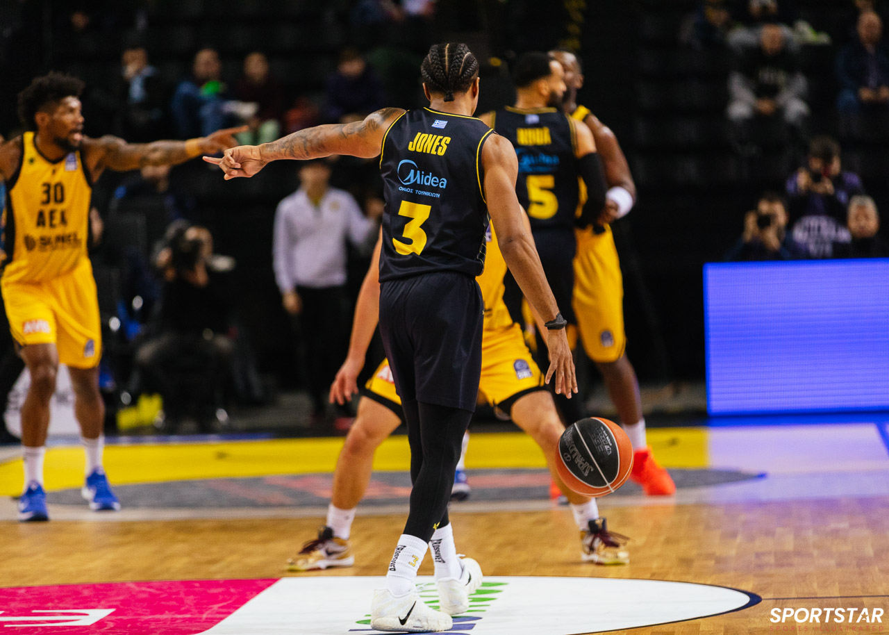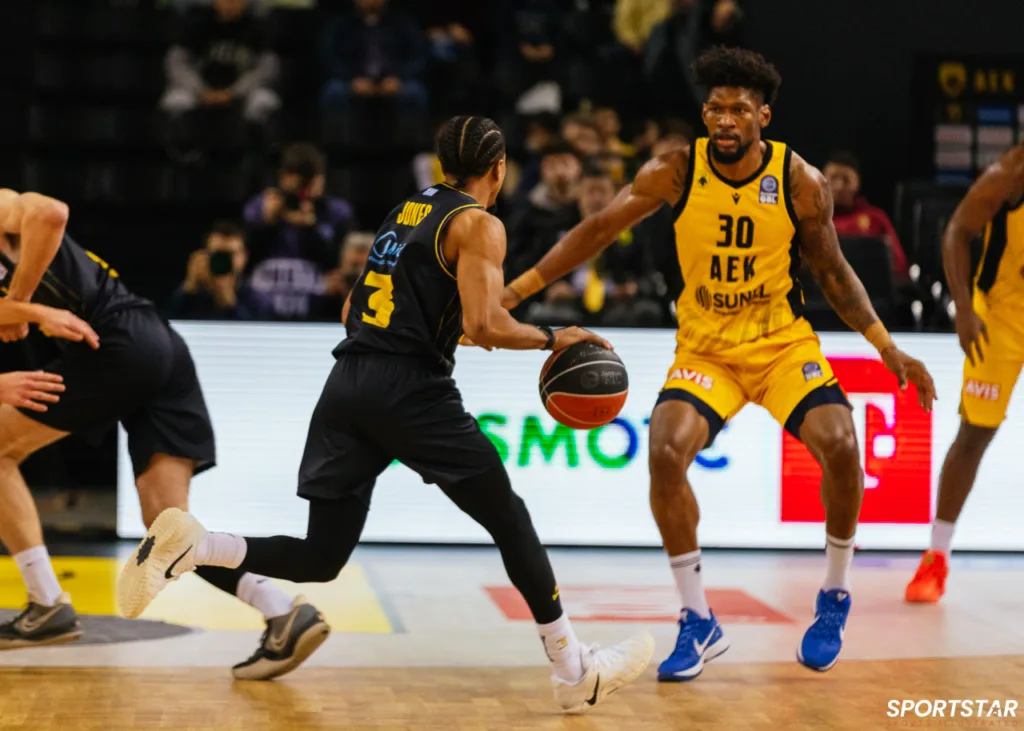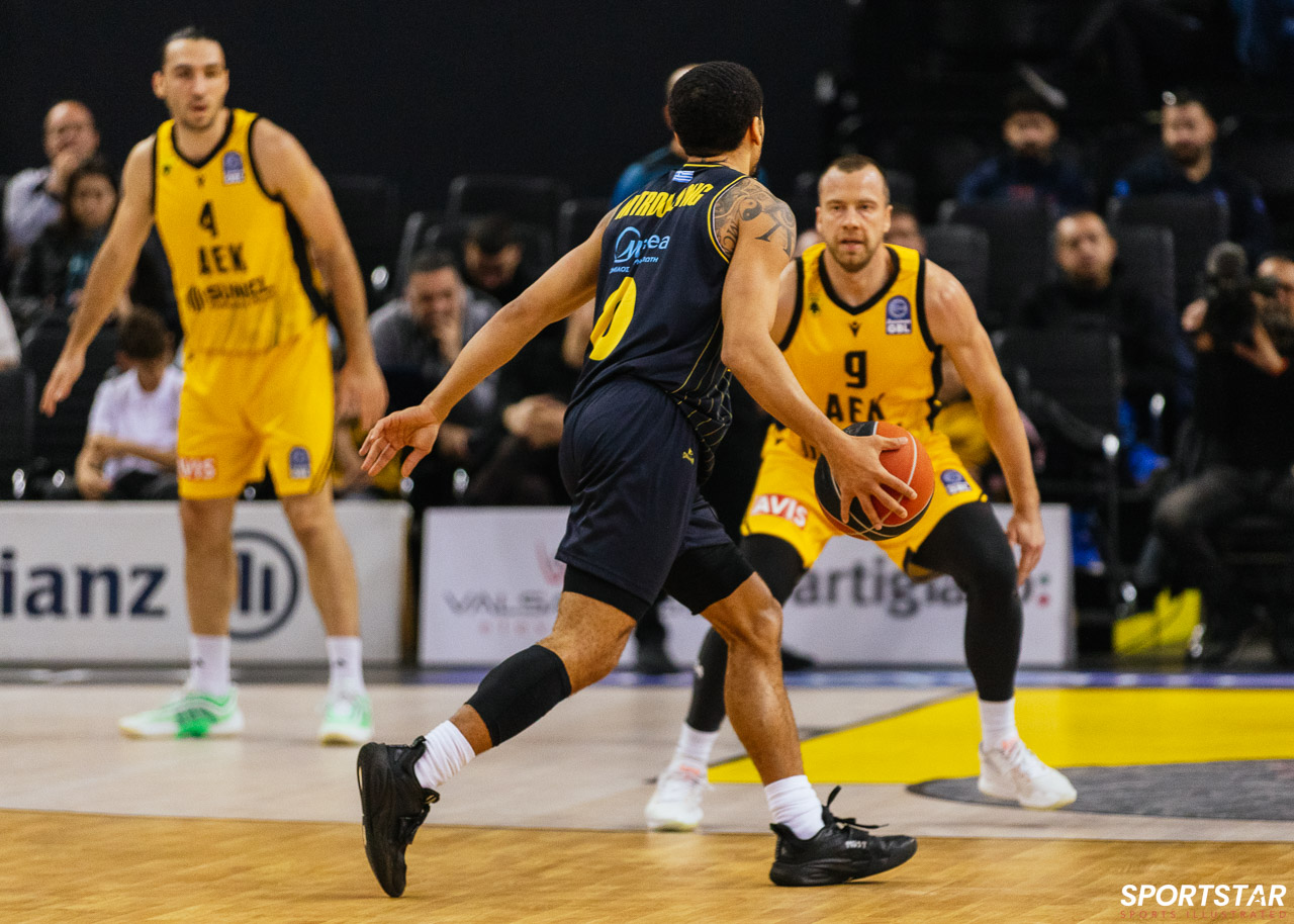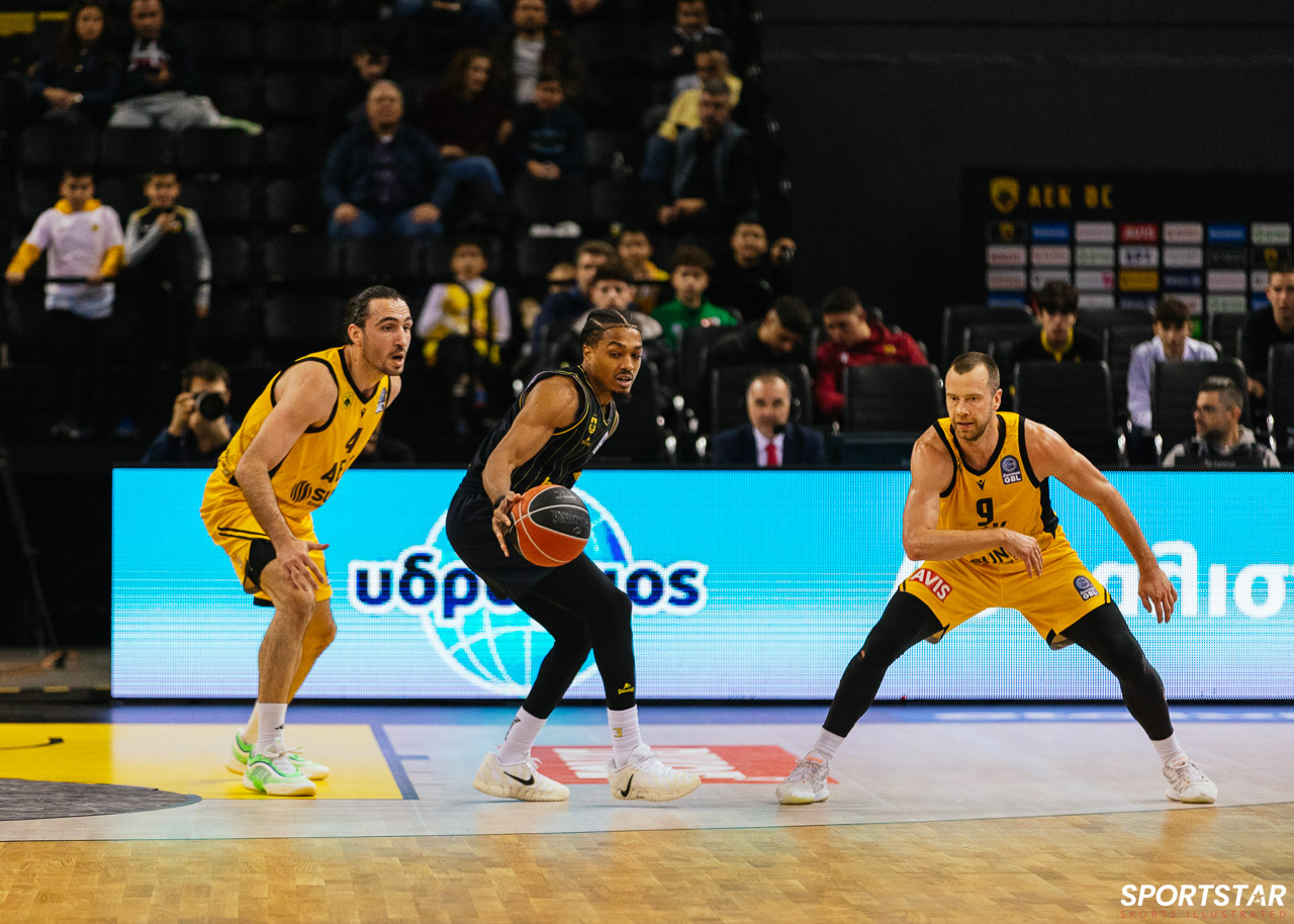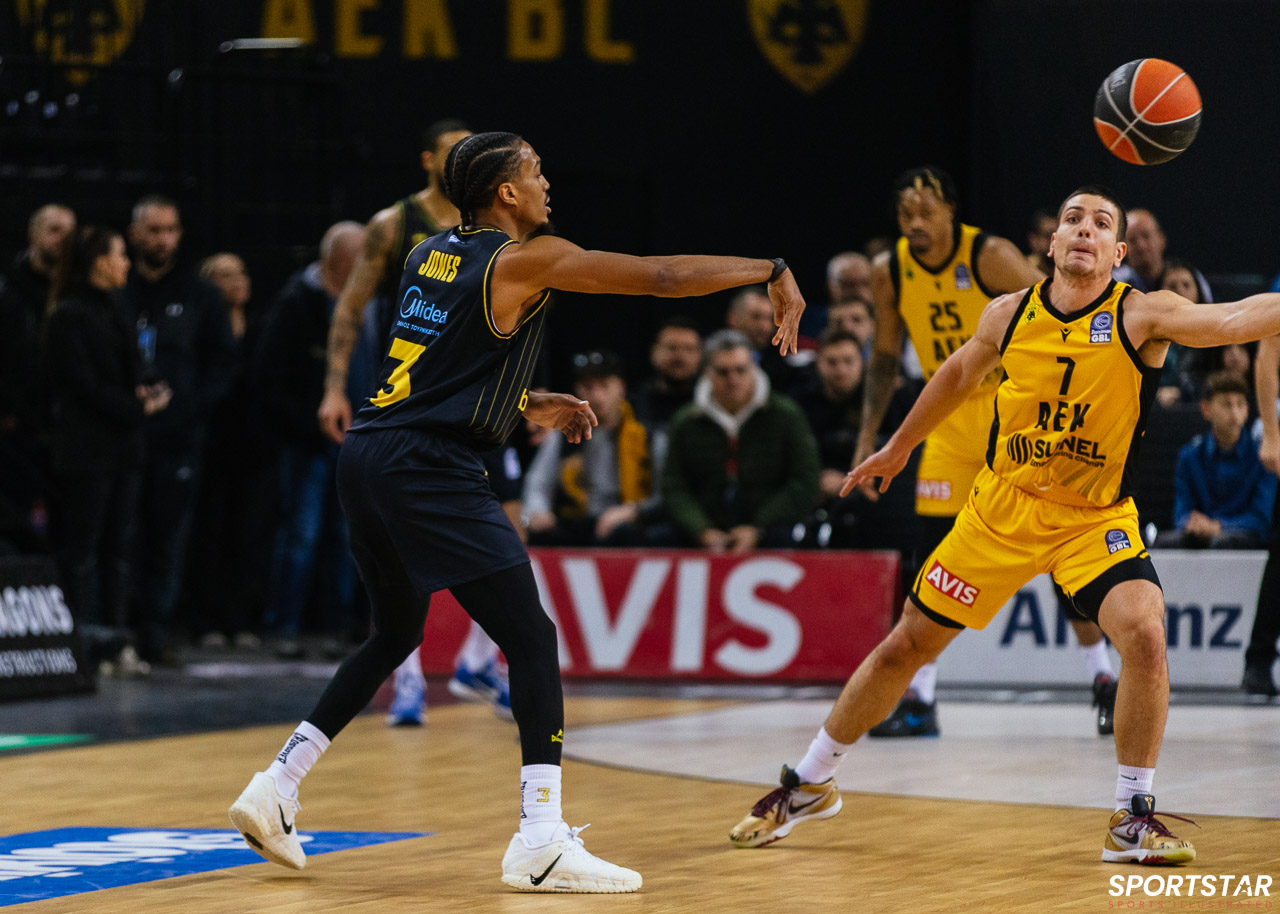 Στιγμιότυπο από τον αγώνα ΑΕΚ - Άρης για την 13η αγωνιστική της GBL στη SUNEL ARENA