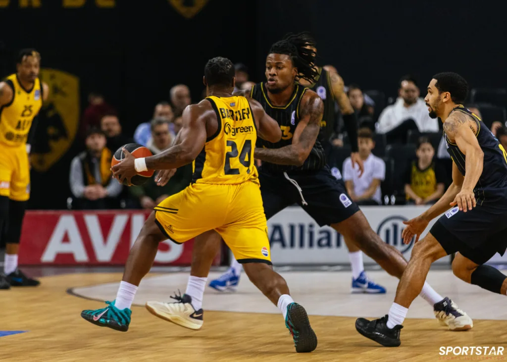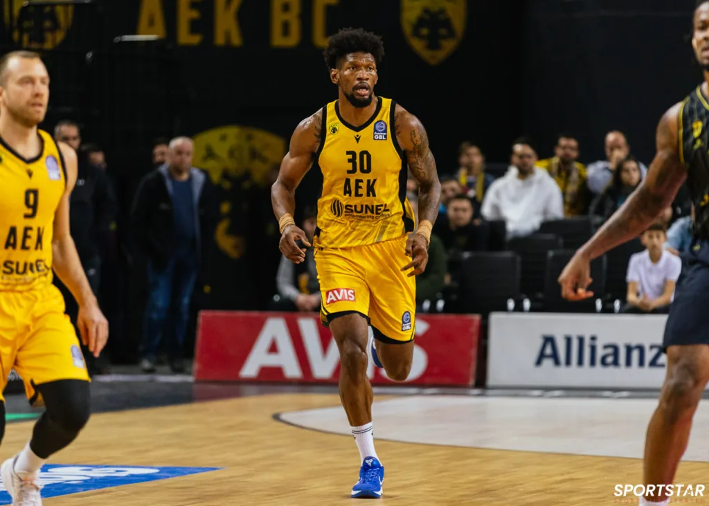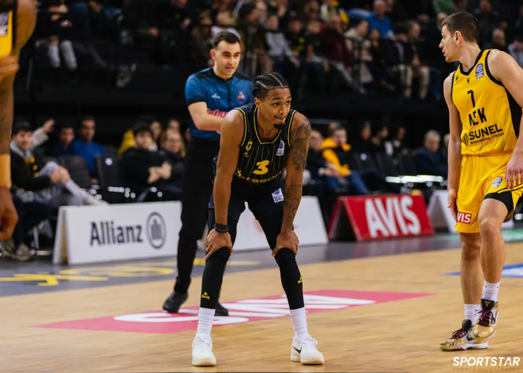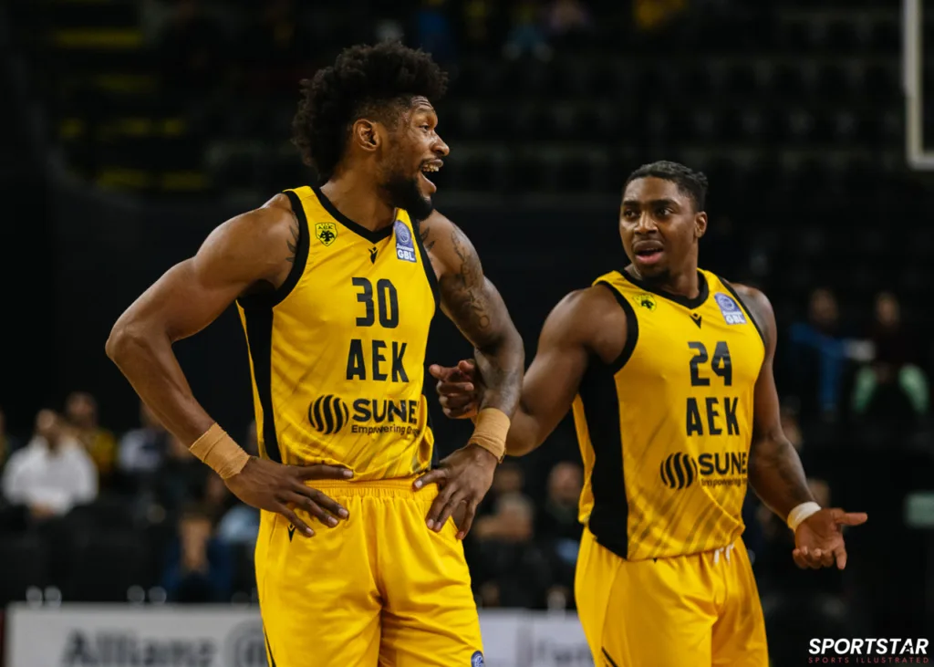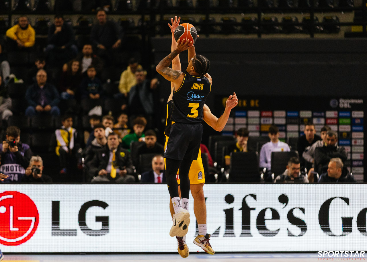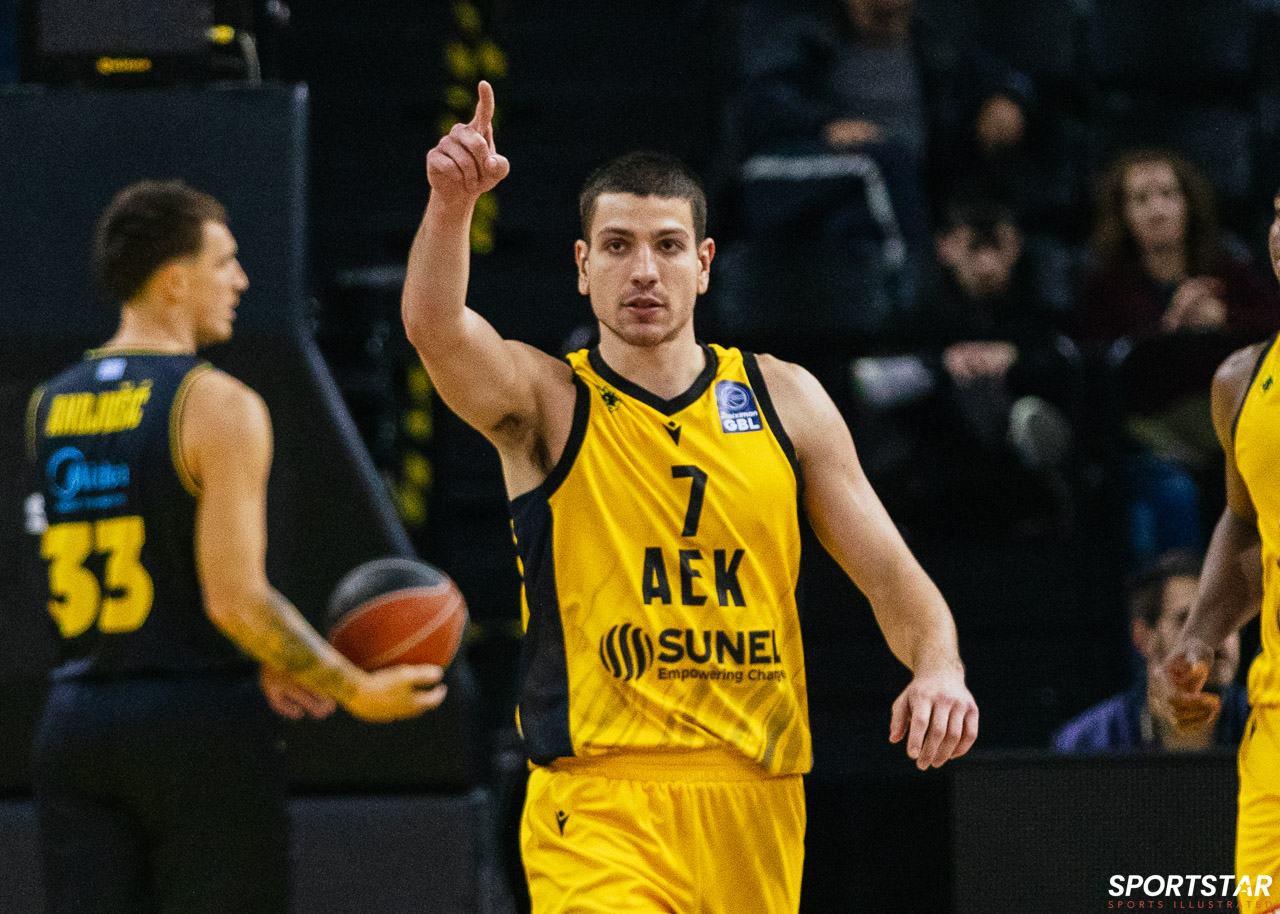 Στιγμιότυπο από τον αγώνα ΑΕΚ - Άρης για την 13η αγωνιστική της GBL στη SUNEL ARENA