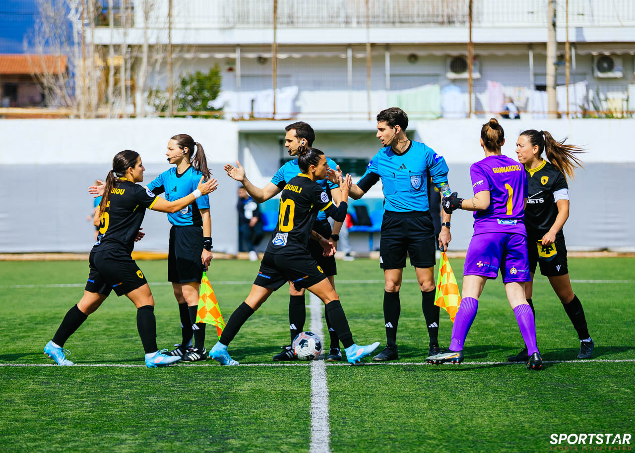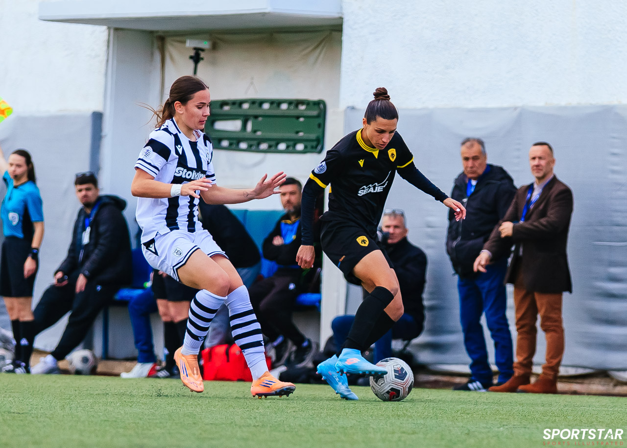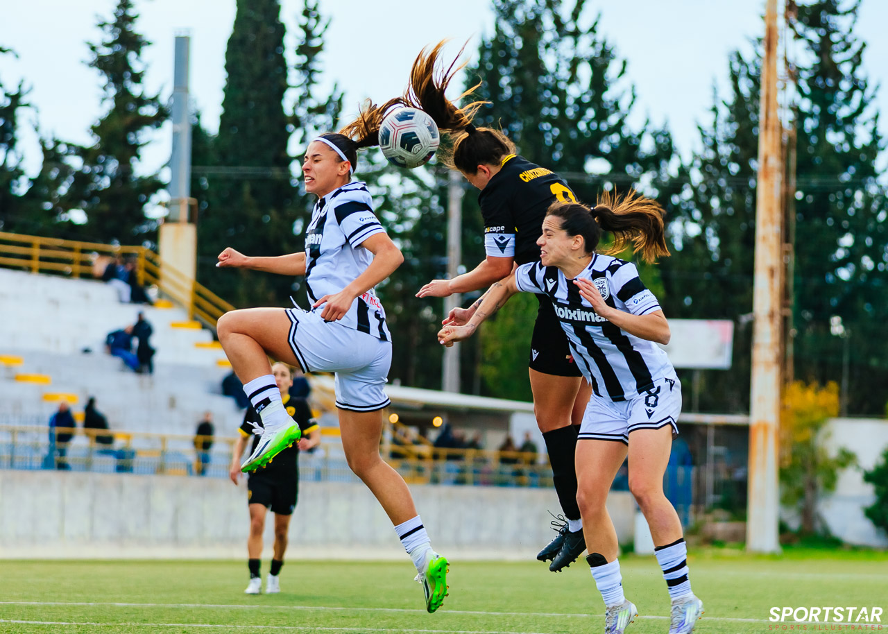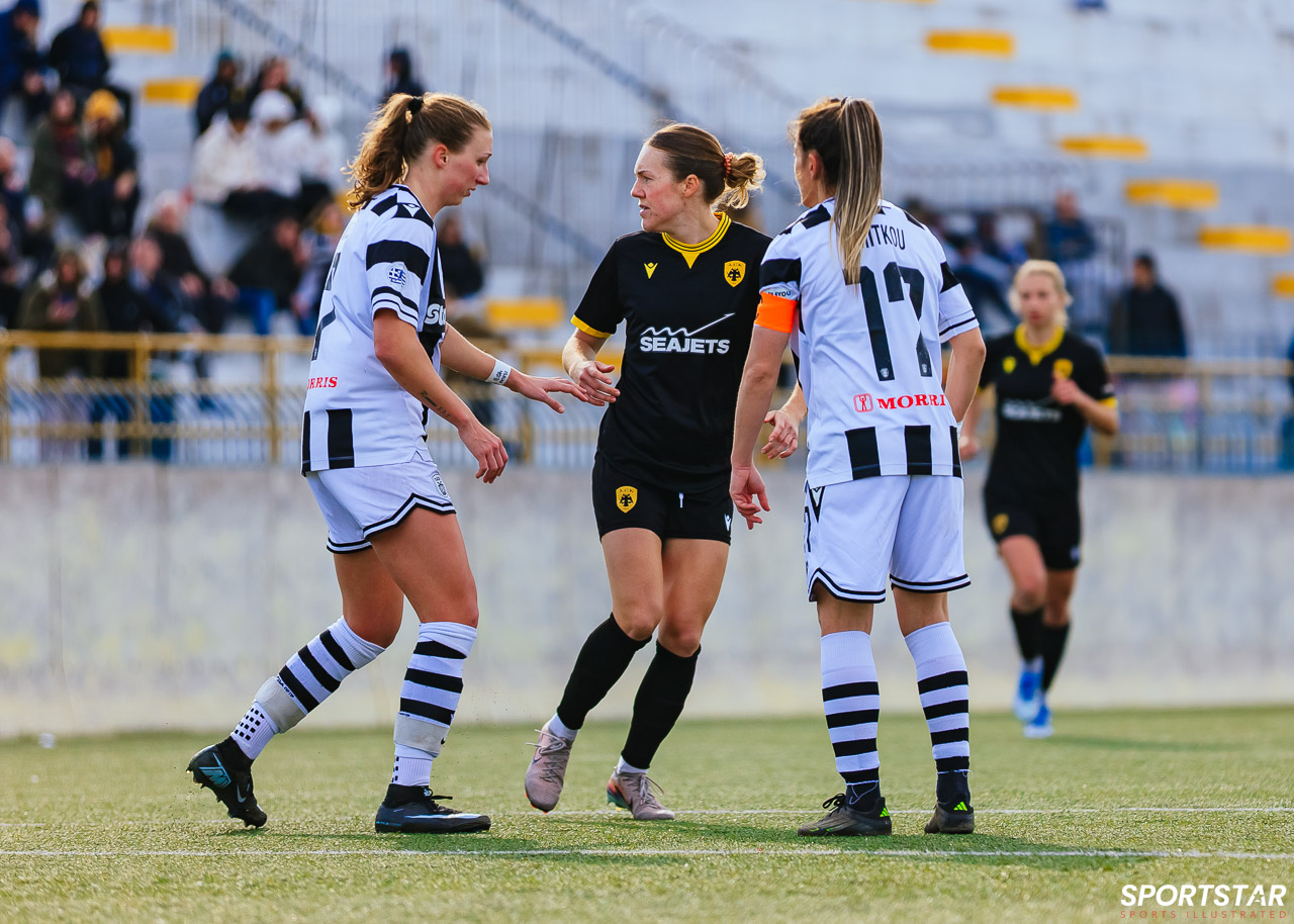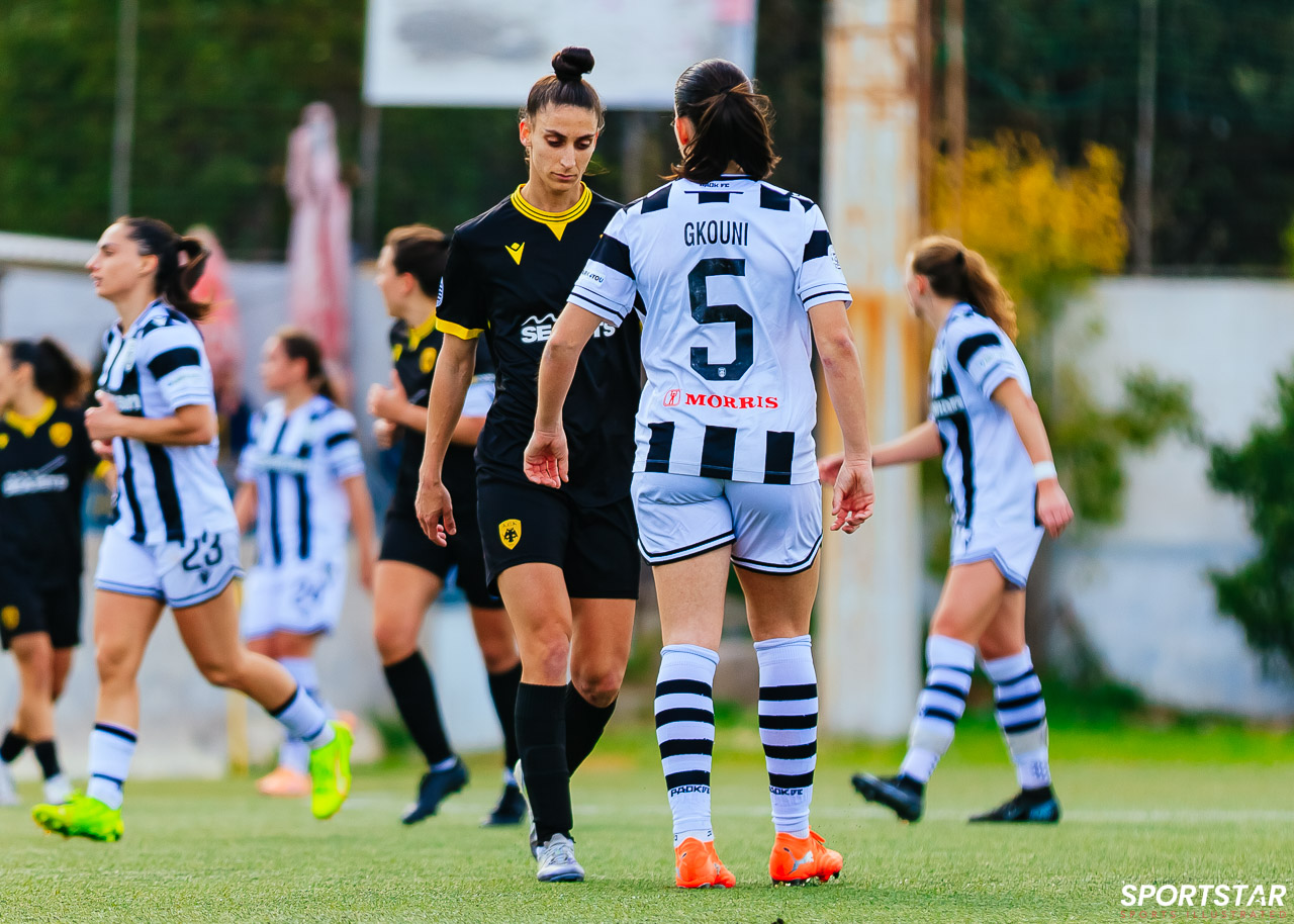 Στιγμές από το μεγάλο ντέρμπι της 20ης αγωνιστικής της Α’ Εθνικής Γυναικών στους Αγίους Αναργύρους, εκεί όπου ΑΕΚ και ΠΑΟΚ έμειναν στο 0-0.
