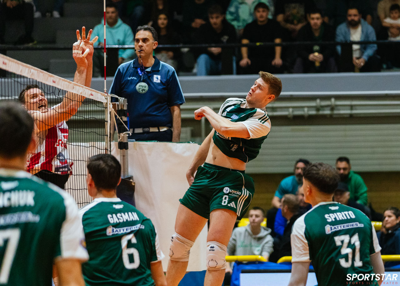 Στο δεύτερο σετ, παρότι οι ερυθρόλευκοι ήταν μπροστά μέχρι το 13-15, η «πράσινη καταιγίδα» απάντησε με ακόμα μεγαλύτερη ένταση. Ο Δανός Ράσμους Νίλσεν ήταν ασταμάτητος και με ένα εντυπωσιακό σερί άσων και επιθέσεων ο Παναθηναϊκός έκλεισε το σετ 25-18, δείχνοντας ότι δεν υπήρχε πρόθεση να αφήσει την πρωτοβουλία του παιχνιδιού. Οι ερυθρόλευκοι προσπάθησαν να αντιδράσουν, με μικρές αντεπιθέσεις και σκορ που τους έφερναν κοντά σε κομβικά σημεία, όμως η συνοχή και η συγκέντρωση των γηπεδούχων απέτρεψαν οποιαδήποτε σημαντική ανατροπή.